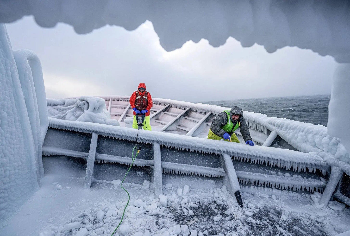As winter storms threaten crews on the Bering Sea, the boats are buffeted by the waves and get sprayed with light mist that freezes on contact. Not much at first—but each second, each minute, each hour left unaddressed, adds tens of thousands of pounds to the boat. In the clip above, the captain estimates 50 to 80 thousand additional pounds are weighing the boat down.