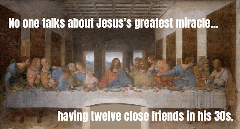I found much in the article to be true. Yet there was this unspoken part of me as I considered the people I’ve engaged with over years—men, in particular—who struggle to connect with peers. I think about that long-tenured meme (though the number can be debated, thanks to Judas):